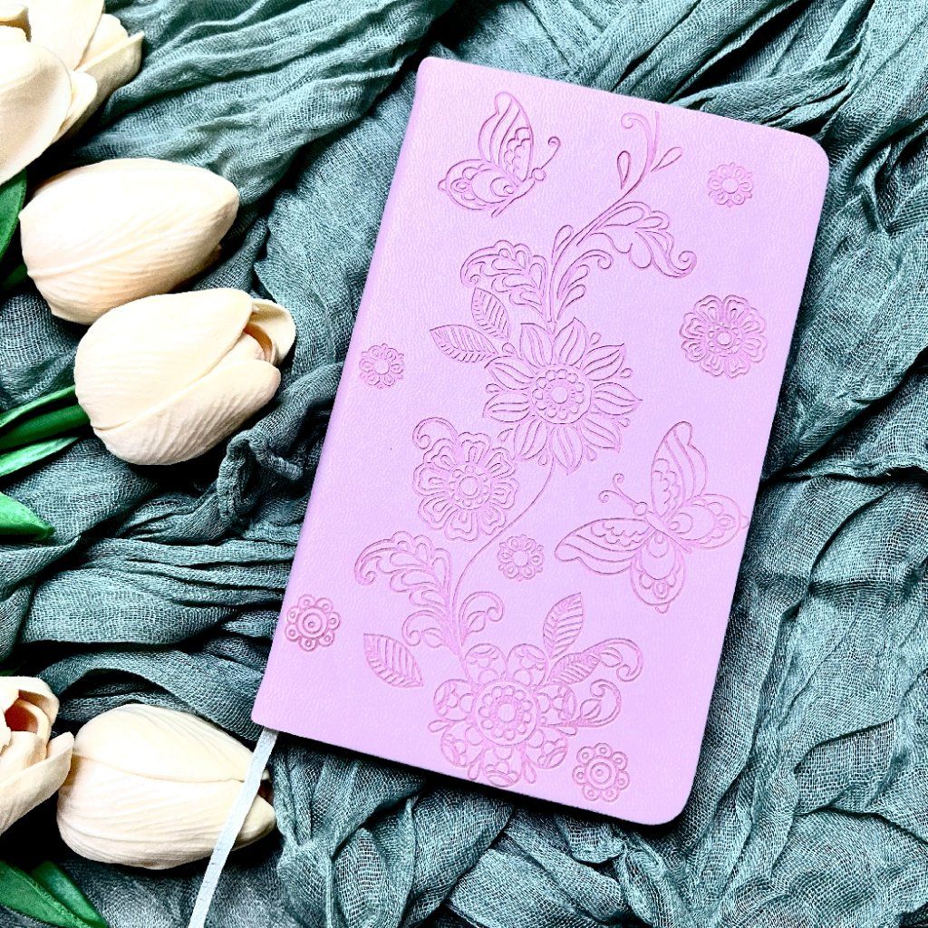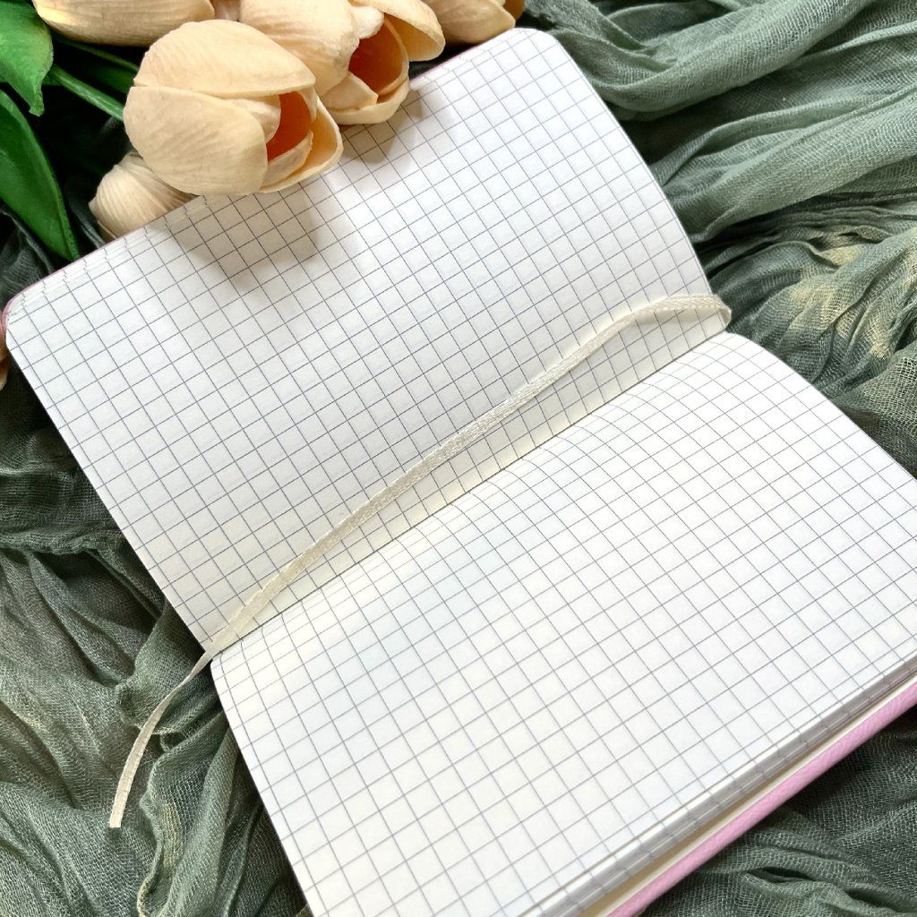 Světle růžový mini zápisník A6 s reliéfním designem a čtverečkovanými stránkami. Ideální na poznámky, plánování i kreslení.