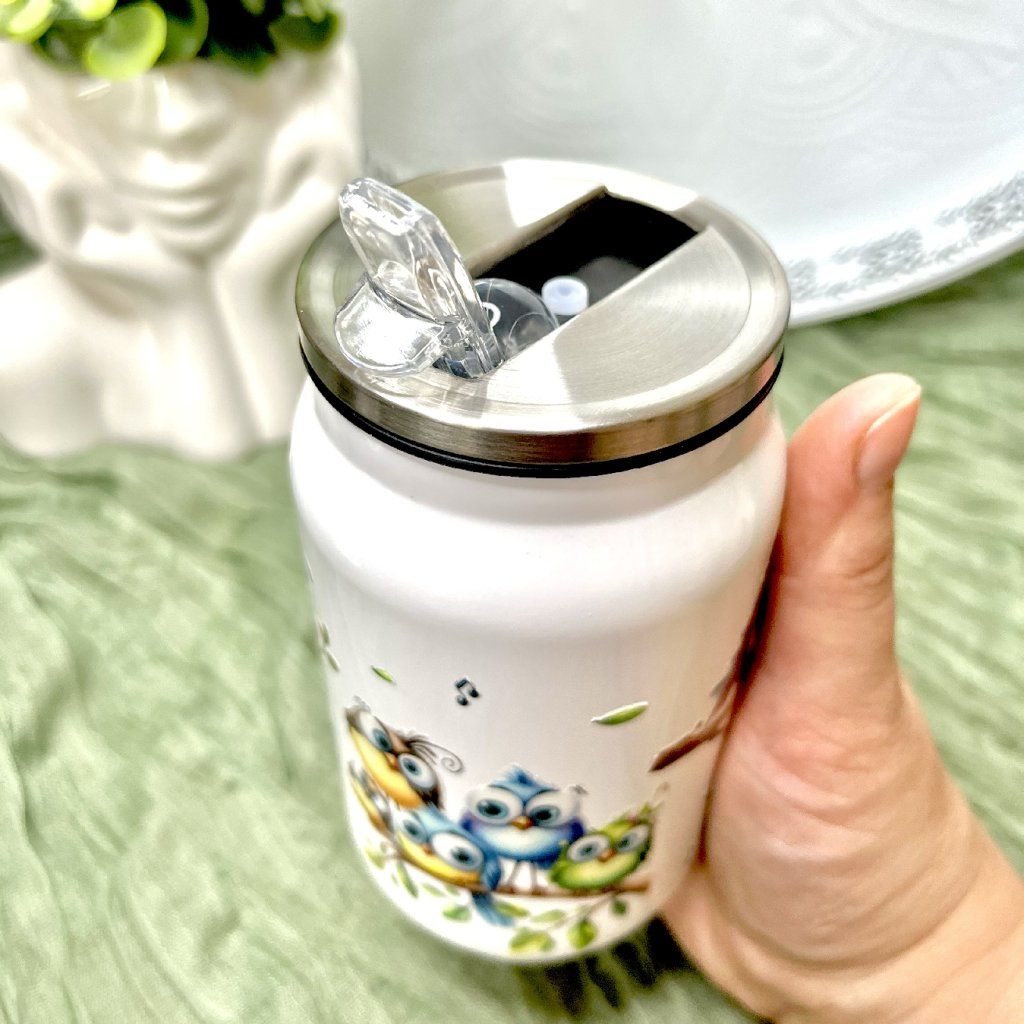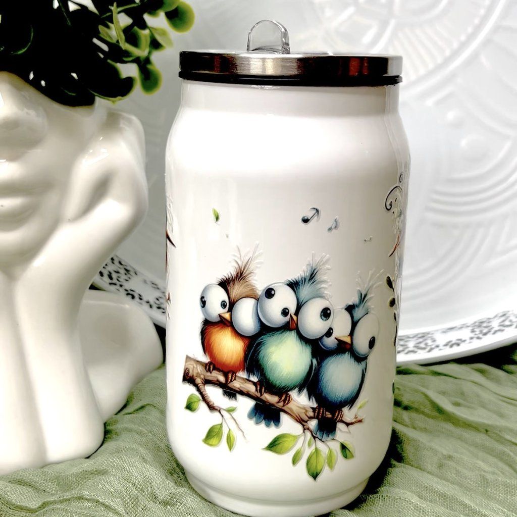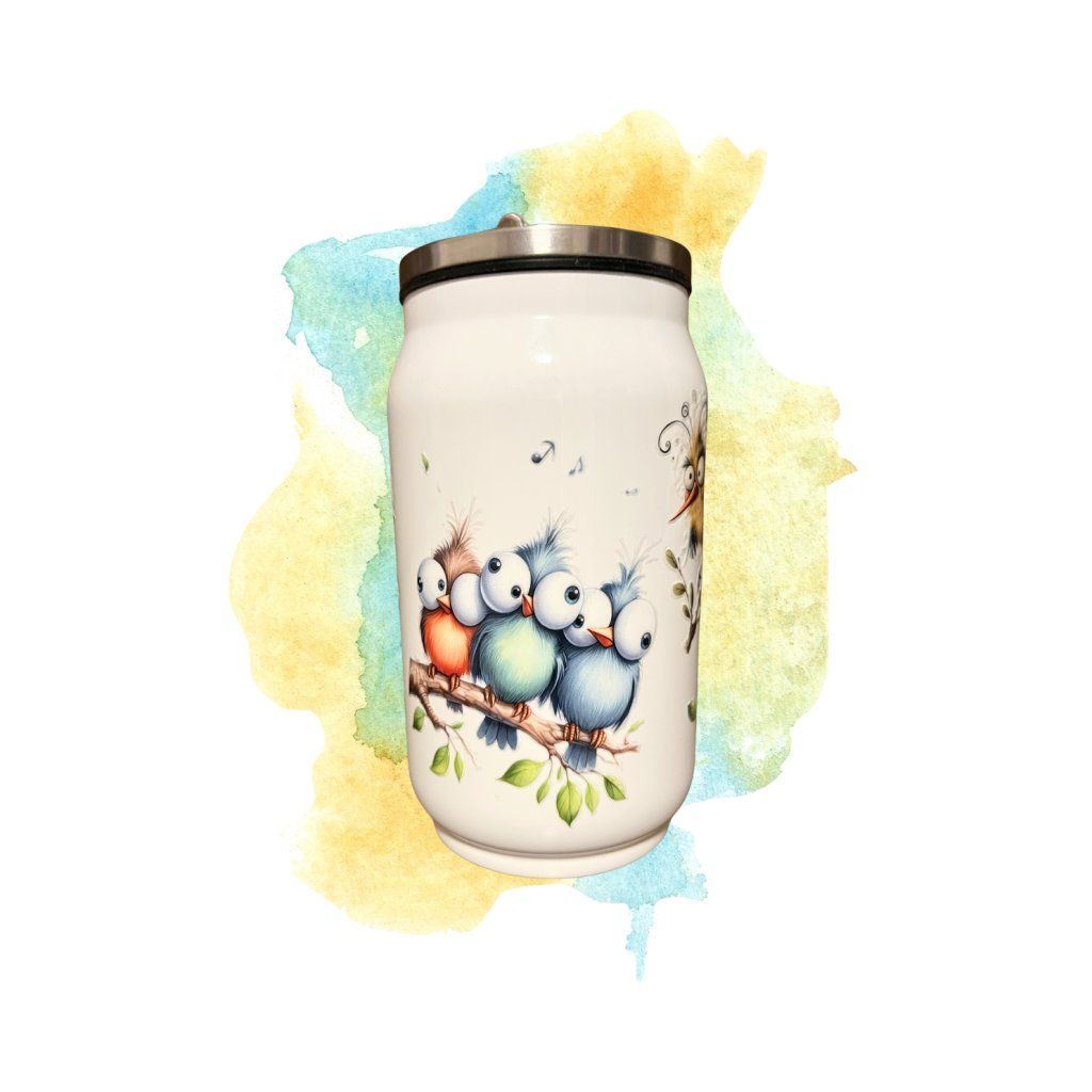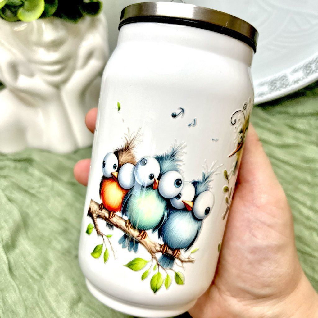 Stylový termohrnek ve tvaru plechovky s roztomilým motivem veselých ptáčků je ideální společník na každý den. Originální design okamžitě zaujme a promění obyčejné pití v malou radost. Díky praktickému víčku a brčku si svůj oblíbený nápoj vychutnáte pohodlně doma, v práci i na cestách.
